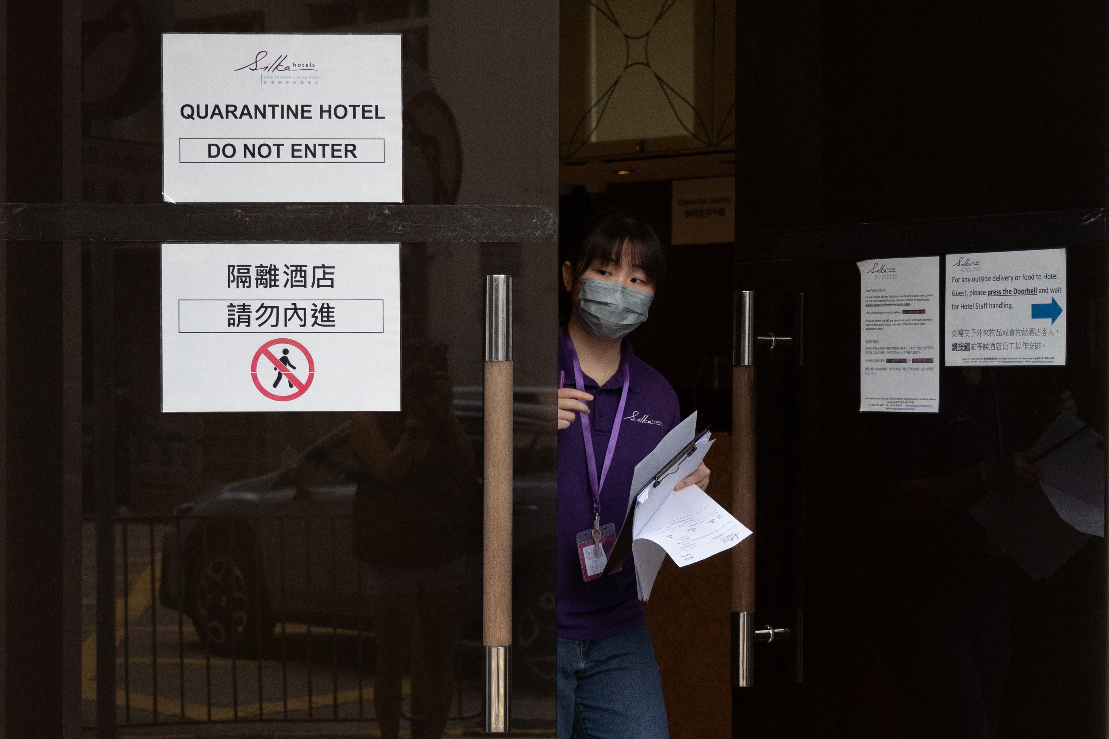 A staff member walks out from a Covid-19 quarantine hotel in Hong Kong on Oct 30, 2021.