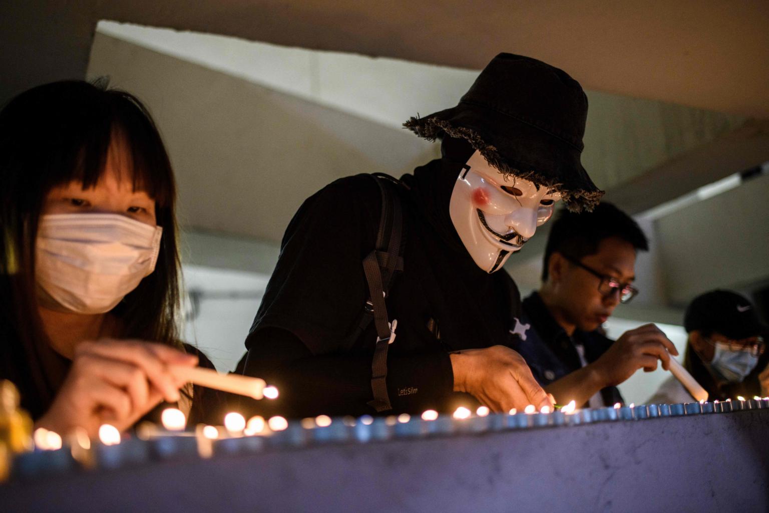 Mourners light candles in Kowloon, Hong Kong, on Nov 8, 2019, as they pay their respects at the car park where a student fell to his death earlier in the week.