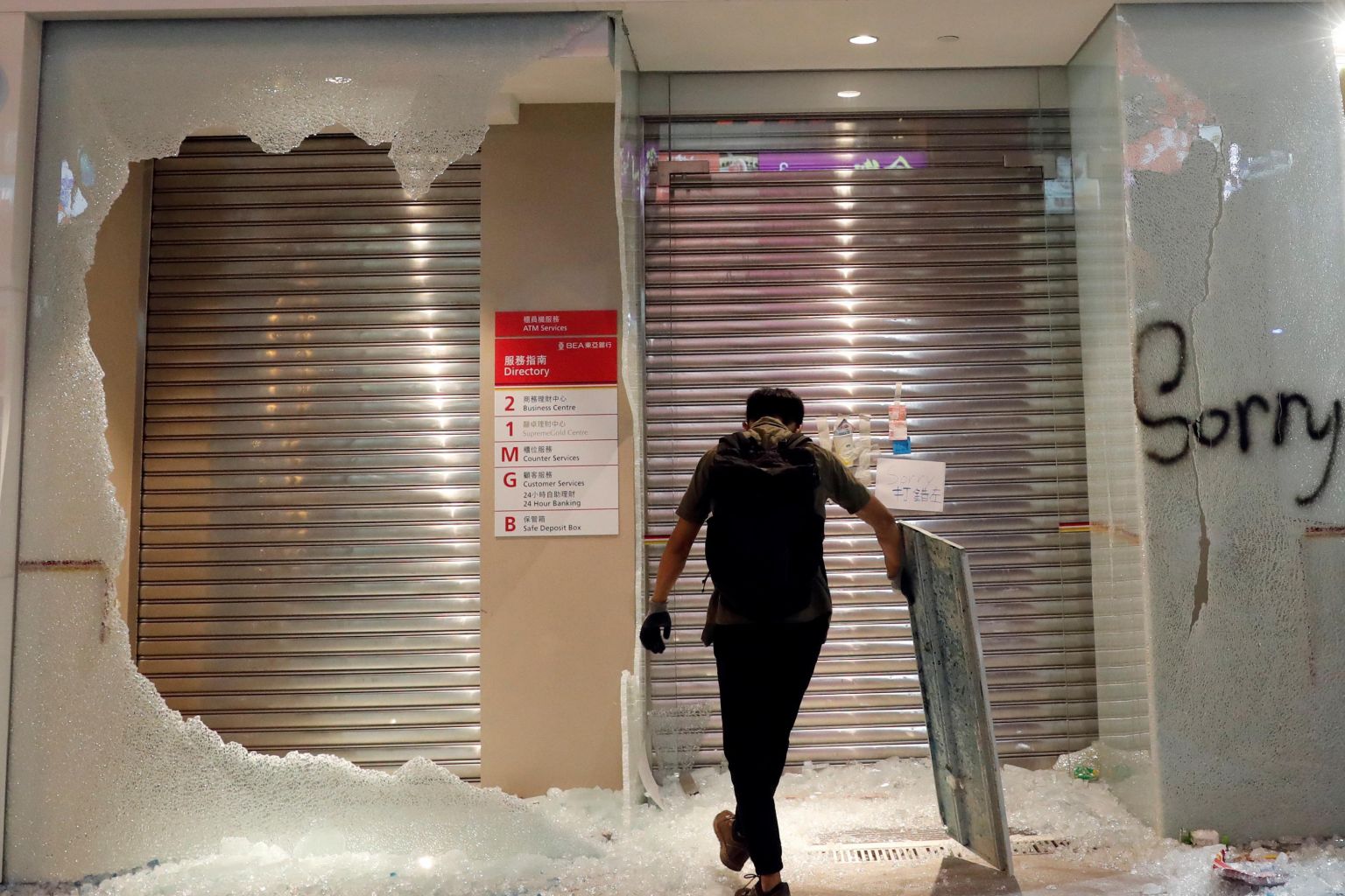 A man stands in front of the Bank of East Asia that was vandalised by anti-government protesters in Hong Kong on Oct 20, 2019.