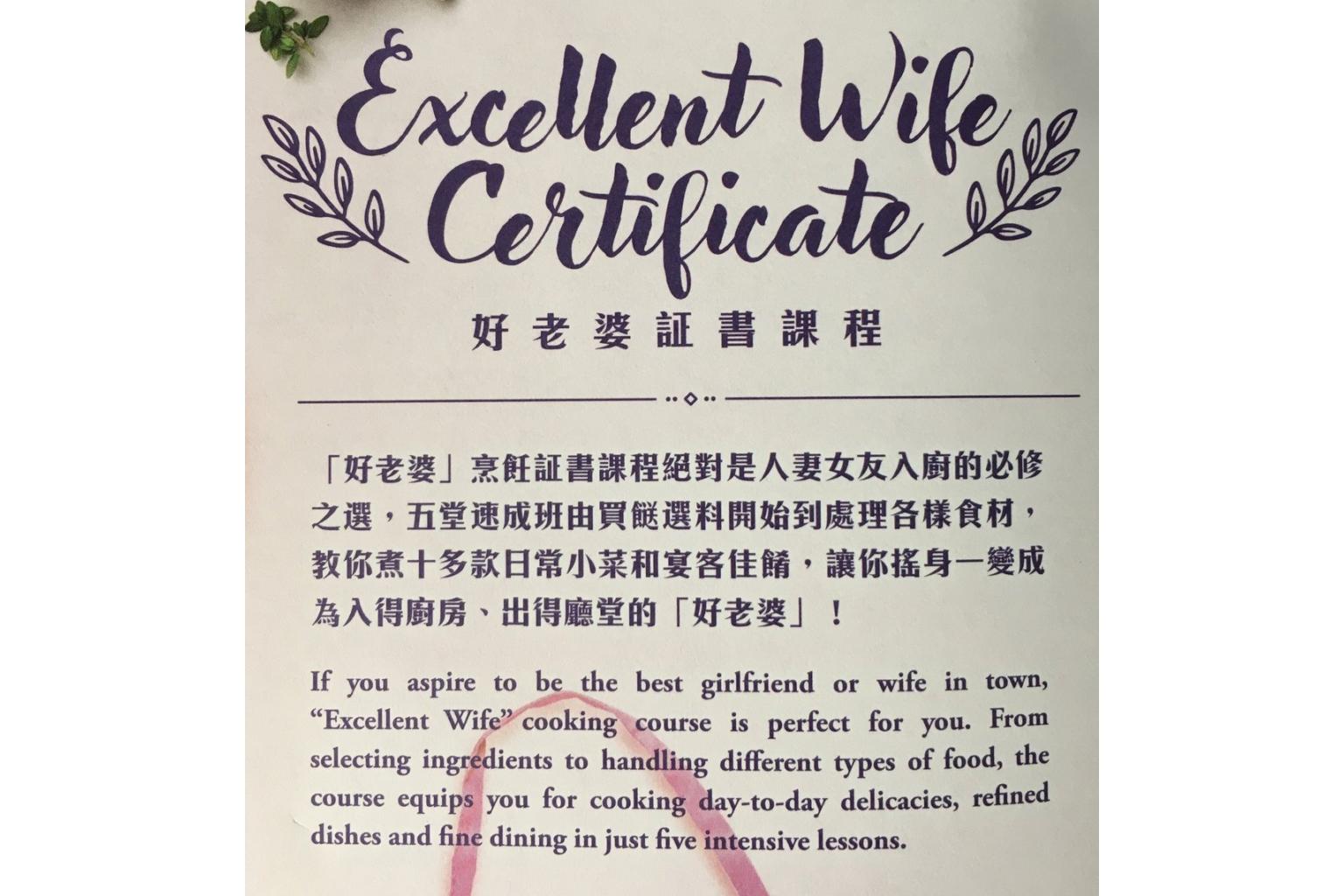 "If you aspire to be the best girlfriend or wife in town, 'Excellent Wife' cooking course is perfect for you," says the text on a flyer by Towngas Cooking Centre, which is operated by Hong Kong & China Gas Co. "Excellent Wife Certificate" is written in bold on the top.