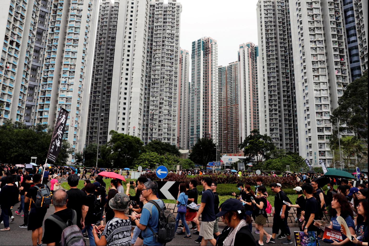 Anti-extradition Bill protesters march against the backdrop of residential buildings in Tseung Kwan O, Hong Kong, on Aug 4, 2019. The government has announced new policies to ease the city's housing crisis.