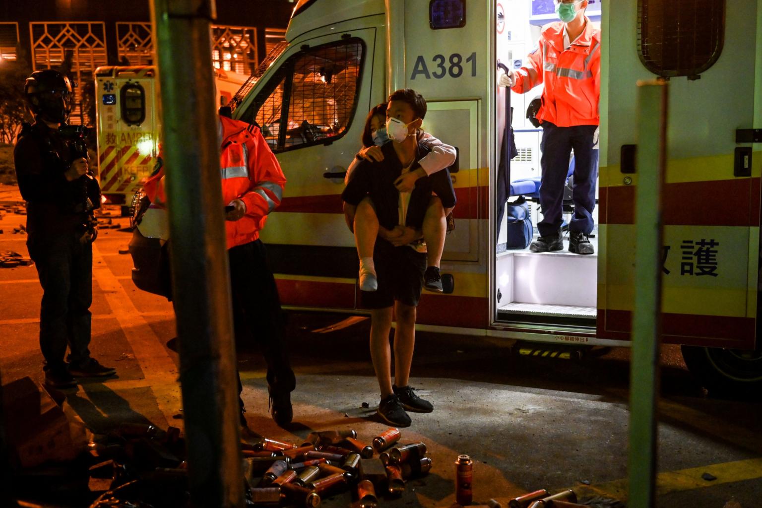 A man carries an injured woman to an ambulance as some protesters leave the Hong Kong Polytechnic University on Nov 19, 2019. Arrests and interrogations of suspects in public hospital rooms have become commonplace.