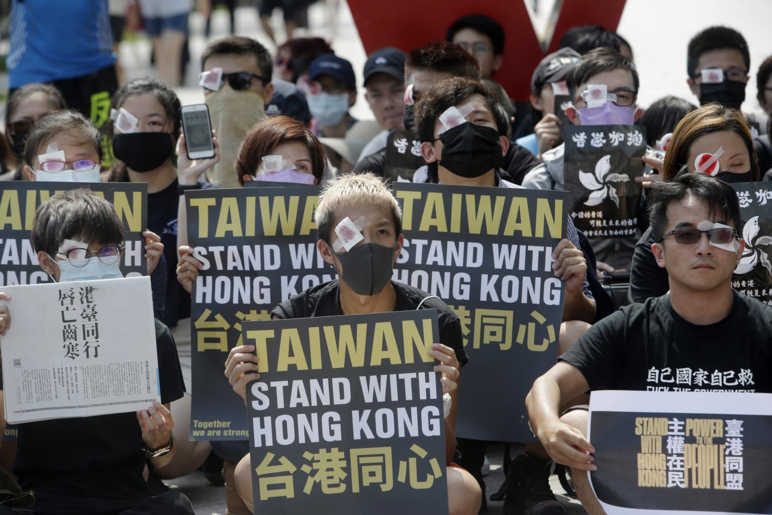 In a picture taken on Aug 17, 2019, Hong Kong students living in Taiwan and Taiwanese supporters wearing symbolic eyepatches and holding slogans gather to support Hong Kong's protesters.
