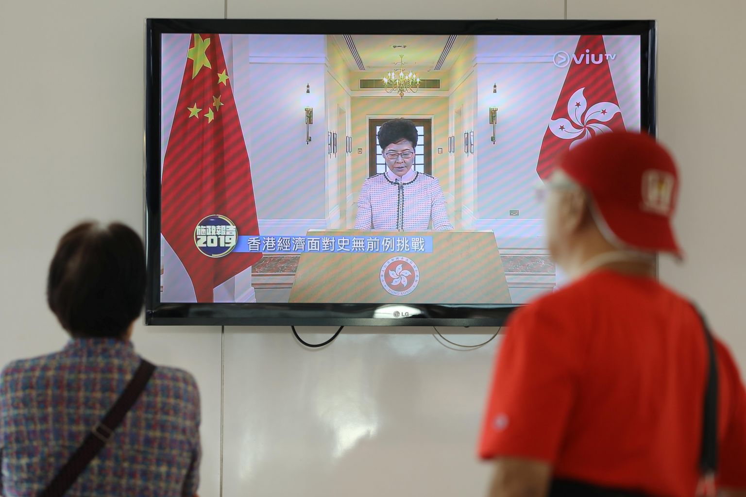 Shoppers watch as Hong Kong Chief Executive Carrie Lam delivers her third policy address via video after her session at the legislative council was disrupted by heckling pro-democracy lawmakers in Hong Kong on Oct 16, 2019.