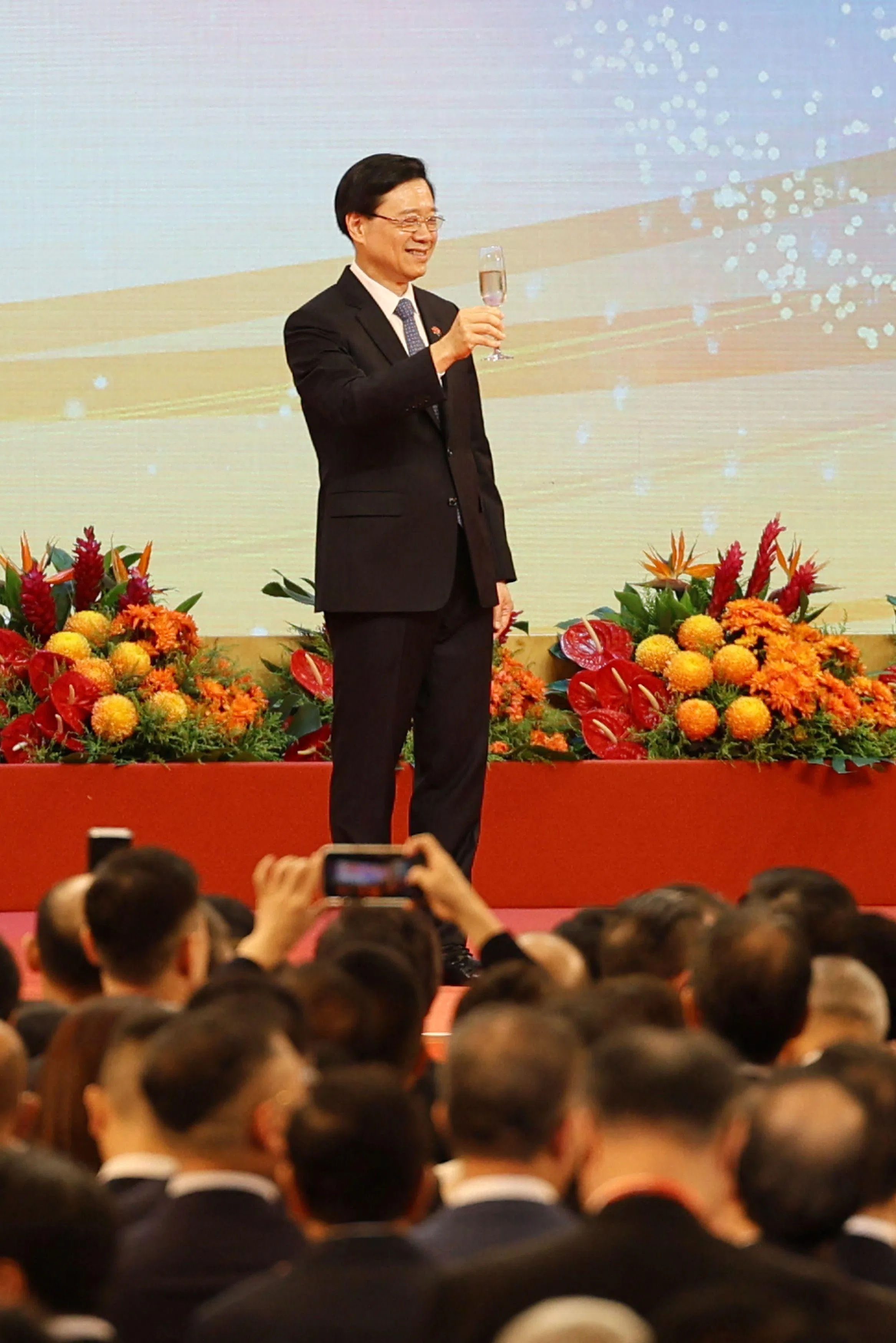 Hong Kong chief executive John Lee raises a toast during an event celebrating the 26th anniversary of the city’s handover from Britain to China, in Hong Kong on July 1.