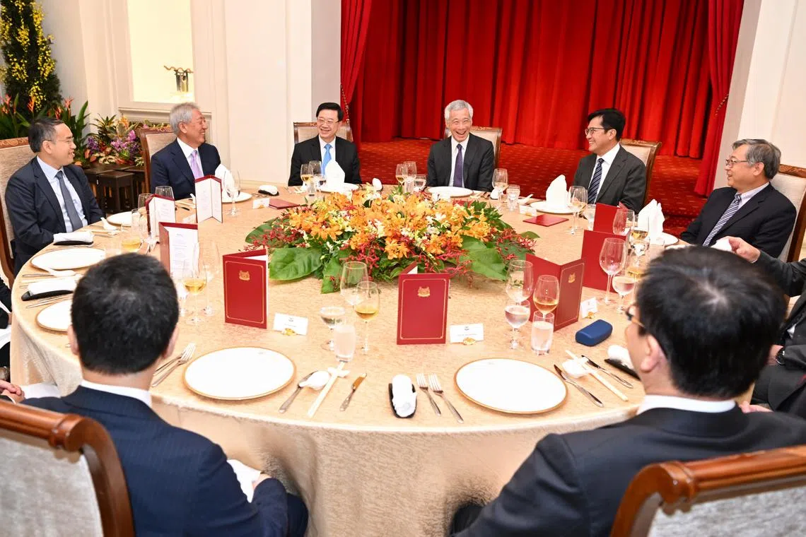 (Facing camera, from left) Hong Kong Secretary for Financial Services and the Treasury Christopher Hui, Senior Minister Teo Chee Hean, Hong Kong Chief Executive John Lee, Prime Minister Lee Hsien Loong, Hong Kong Deputy Financial Secretary Michael Wong, and Minister for Trade and Industry Gan Kim Yong at a lunch hosted by PM Lee at the Istana on Monday.