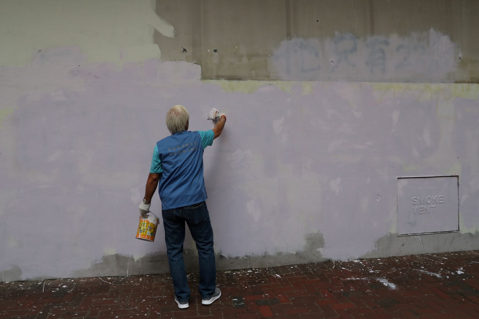 In a picture taken on Dec 9, a man paints over protest graffiti slogans from the previous day's protest march in Hong Kong.