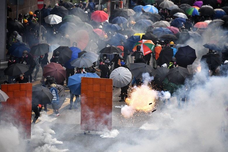 Anti-government protesters retreat as a tear gas canister explodes near Lippo Centre, Hong Kong, on Sept 29, 2019.