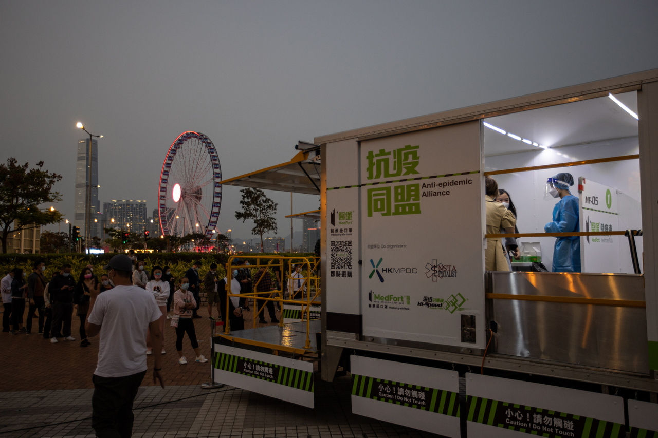 People queueing to get tested for Covid-19 at a mobile station in Hong Kong's Central district on March 13, 2021.