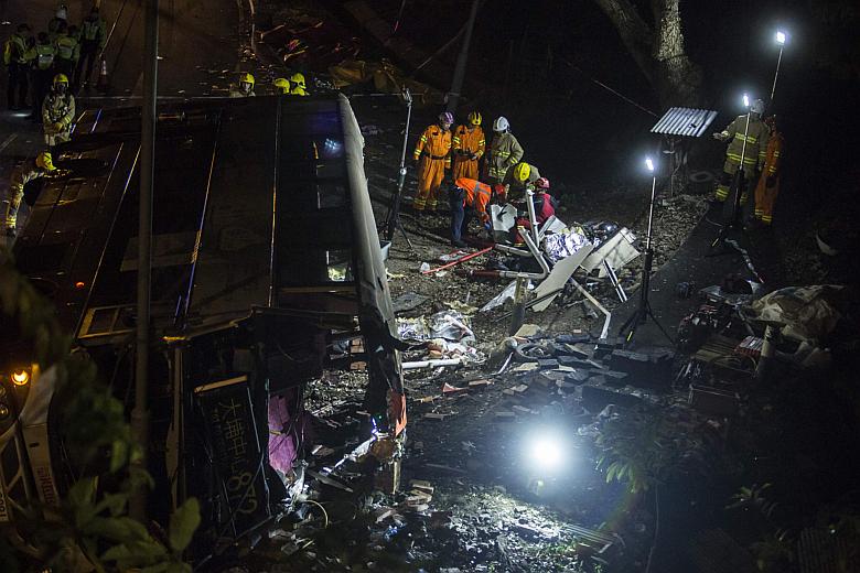 HONG KONG (AFP) - Hong Kong police said on Sunday (Feb 11) they were investigating a deadly bus accident that left 19 people dead and scores more injured, with the bus driver arrested for dangerous driving.