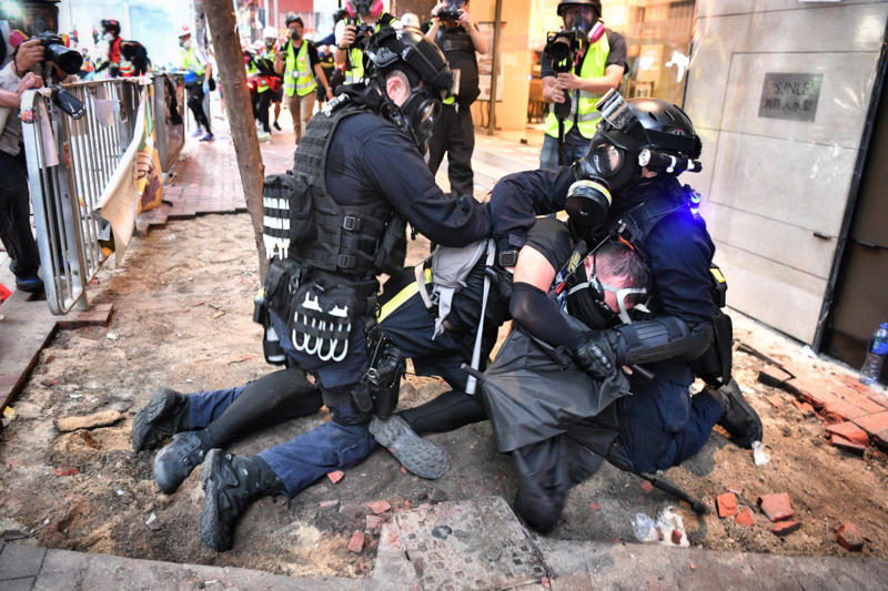 A protester being detained in Hong Kong's Wan Chai district on Oct 1, 2019.