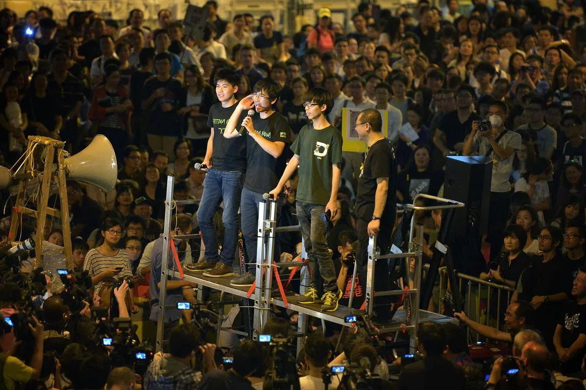 Protest organisers (left to right) Lester Shum, Alex Chow, Joshua Wong and Benny Tai addressing protesters, in response to the government’s cancellation of the scheduled talks in October 2014.