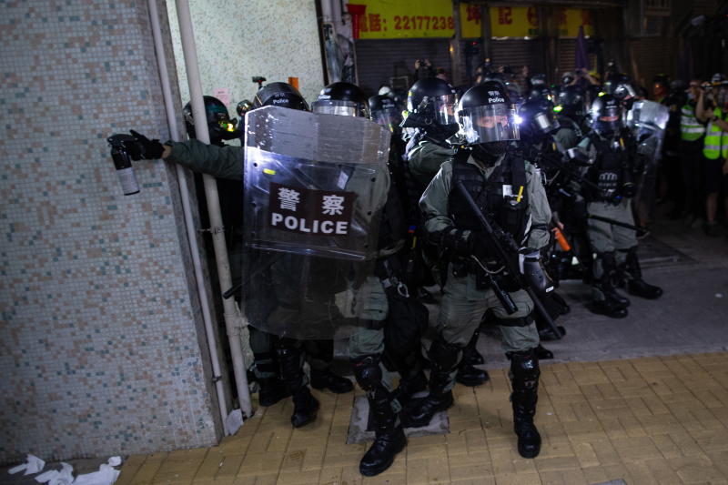 Anti-riot police preparing to use pepper spray during a rally in Hong Kong, China, on Nov 9, 2019.