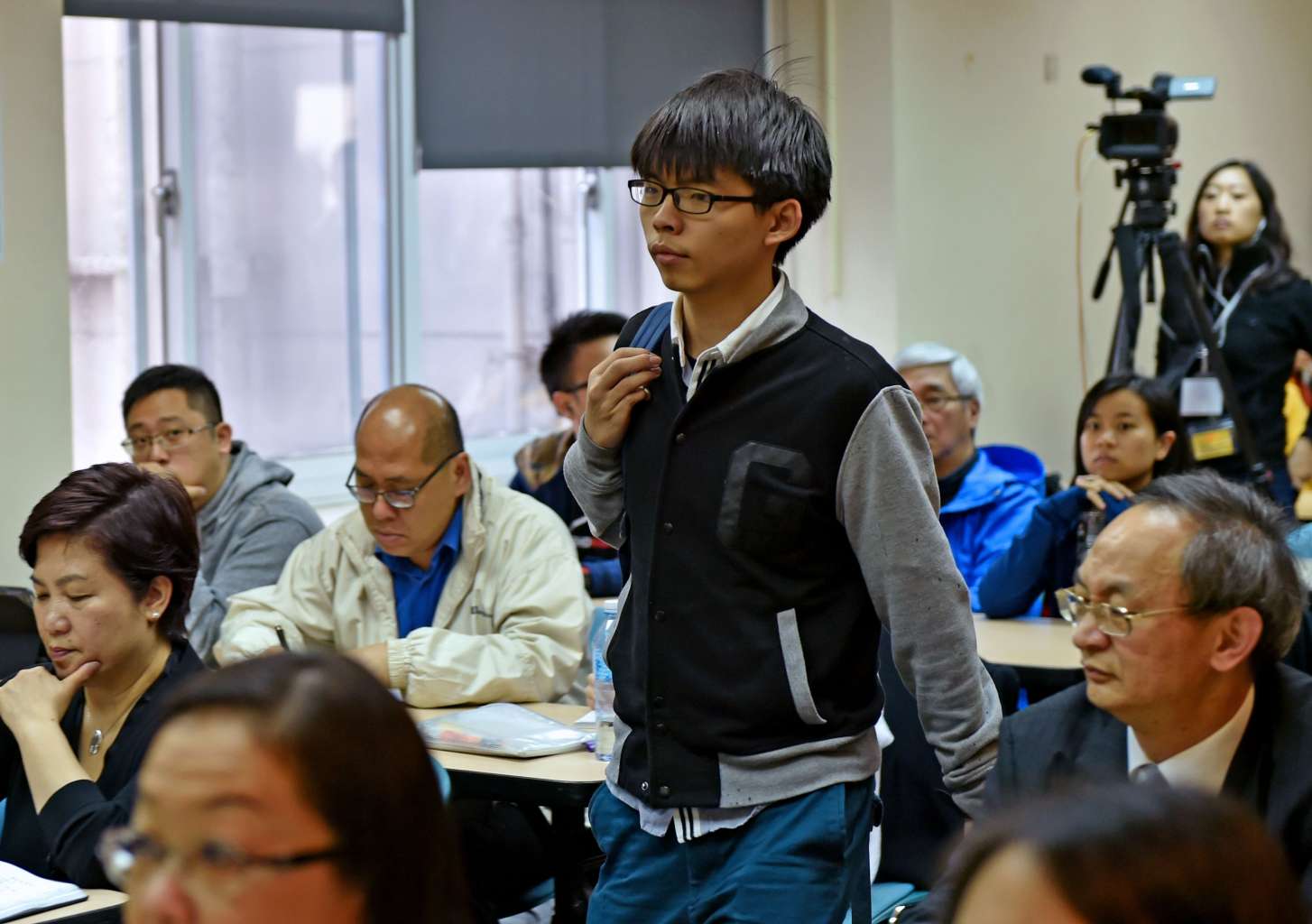 Joshua Wong (centre), the teenage face of Hong Kong's Umbrella Movement, at a press conference in Taipei on Jan 17, 2016.