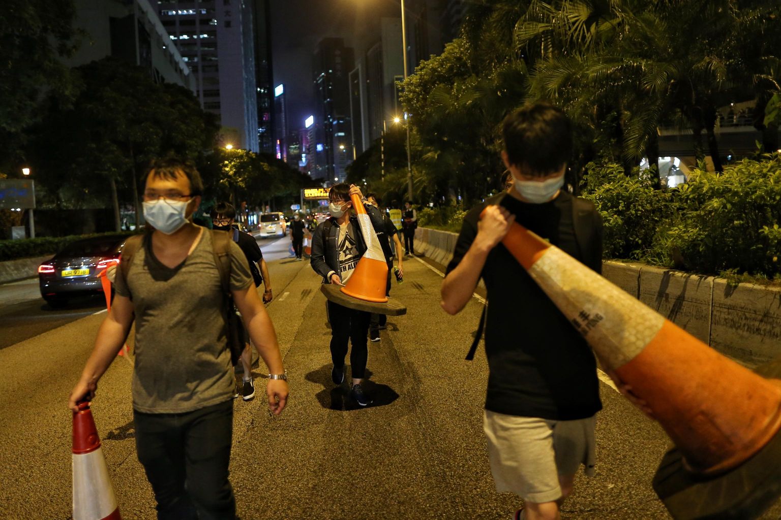 Protesters carrying traffic cones gather outside the Wan Chai Police Headquarters after a rally in Hong Kong, on June 26, 2019.