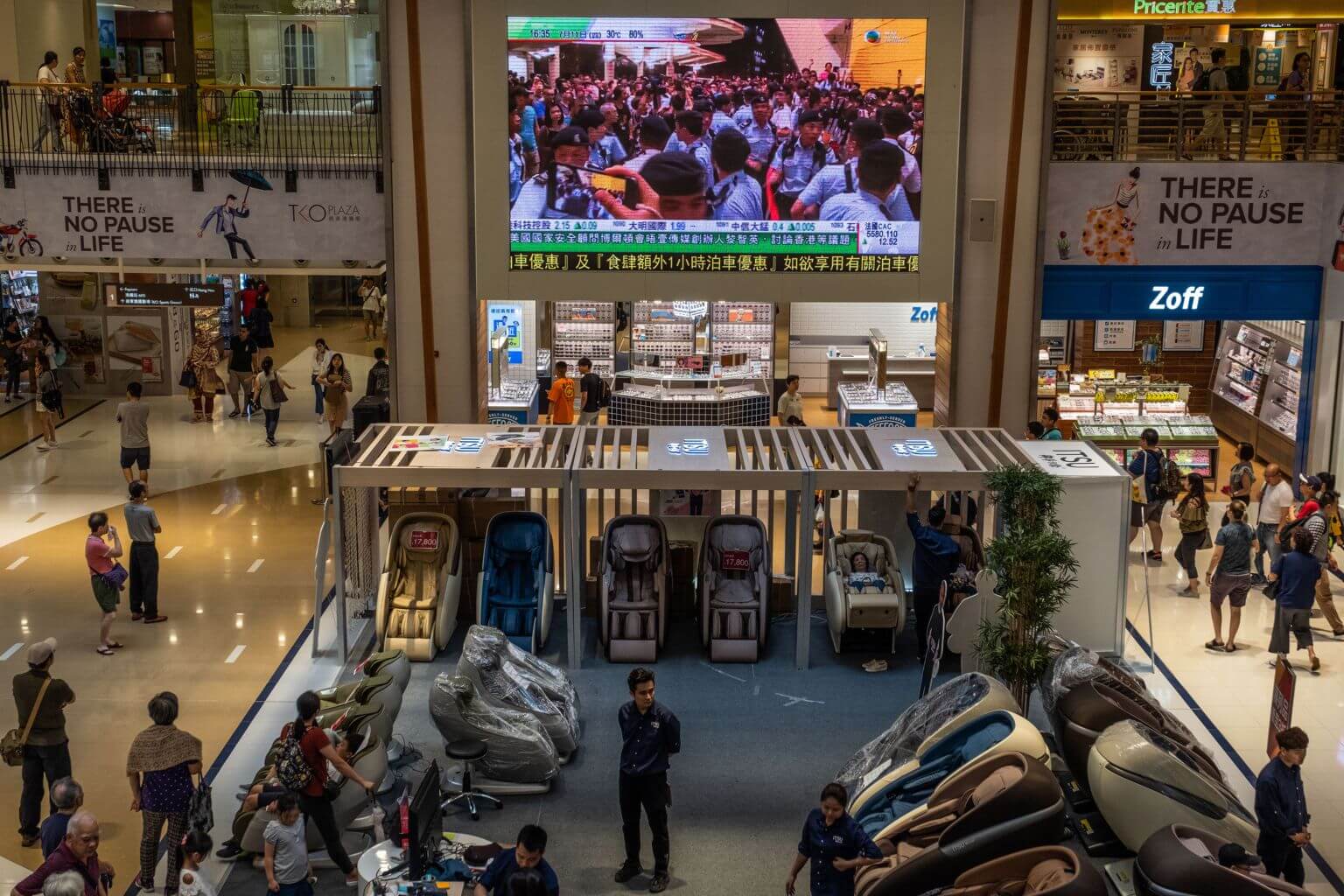 A TVB broadcast on a screen at a shopping mall in Hong Kong, on July 11, 2019.