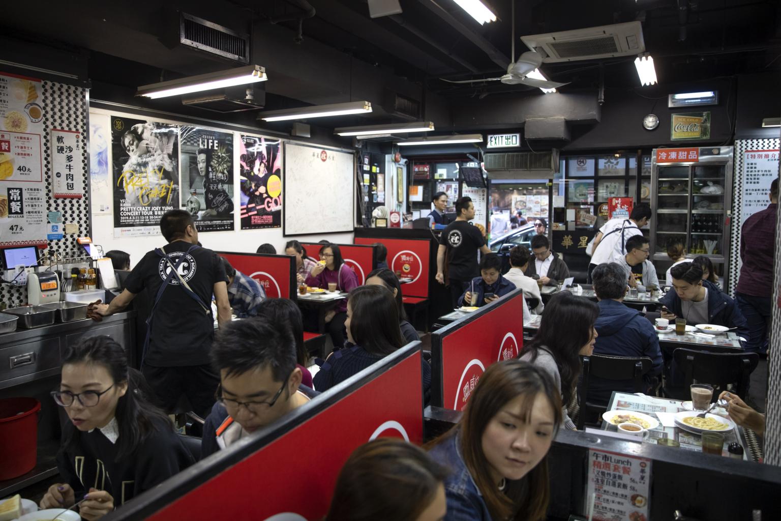 Lunchtime at Capital Cafe in Hong Kong. Guiding the consumer choices of tech-savvy protesters are apps that colour-code businesses into two categories: yellow for protest-friendly, blue for suspected opponents.