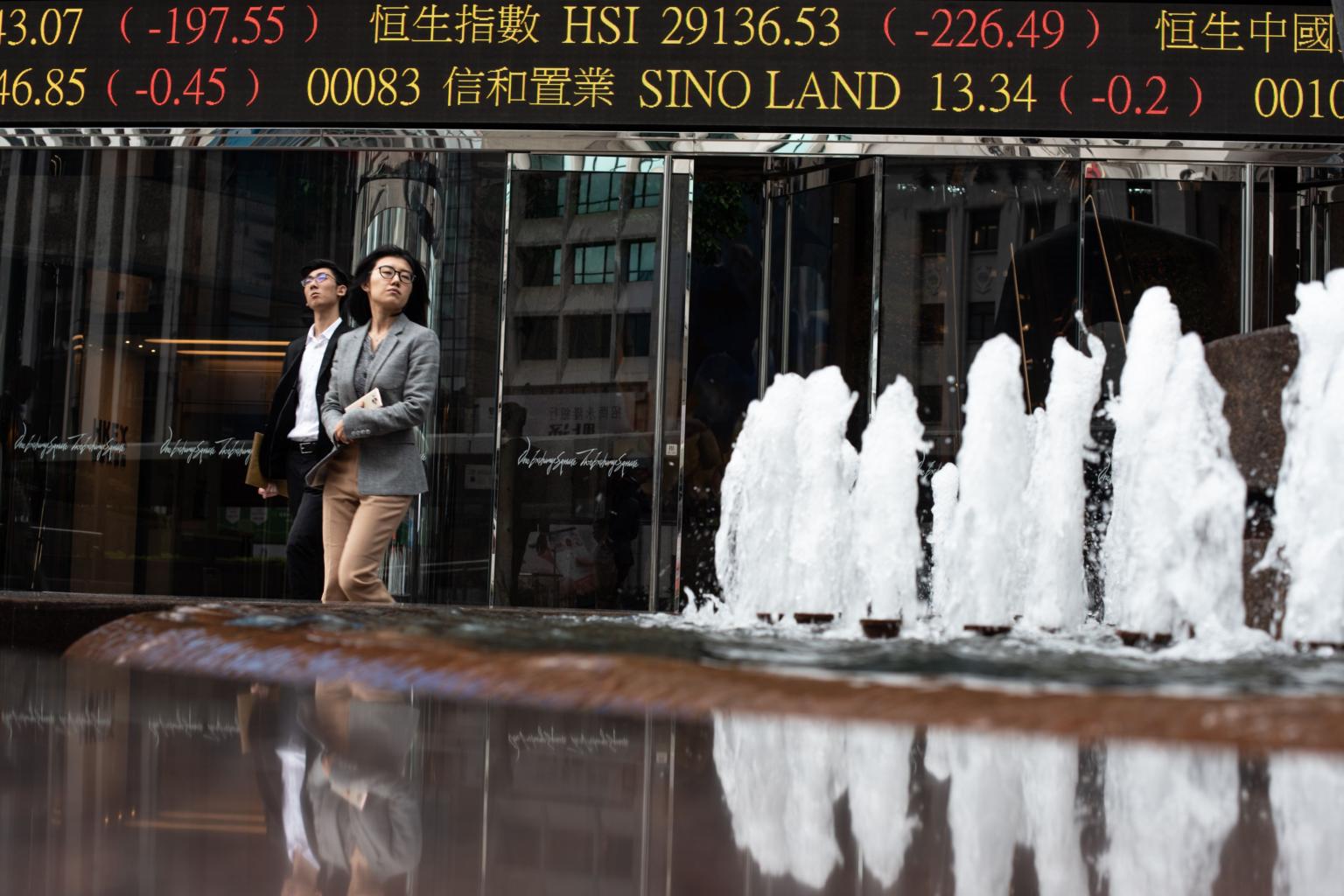 Pedestrians walk in front of a screen at Exchange Square showing stock price movements in Hong Kong on May 8, 2019.