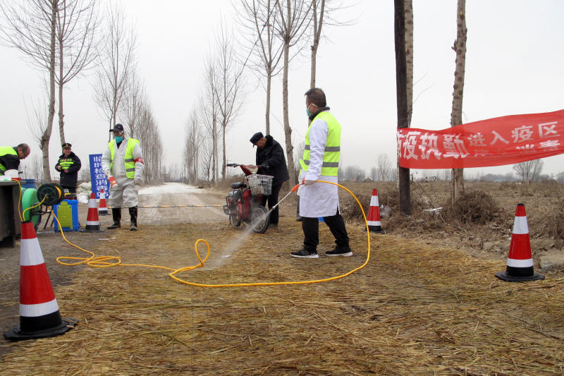 Police officers and workers in protective suits are seen at a checkpoint on a road leading to a farm where African swine fever was detected, in Xushui district of Baoding, Hebei province, China on Feb 26, 2019.