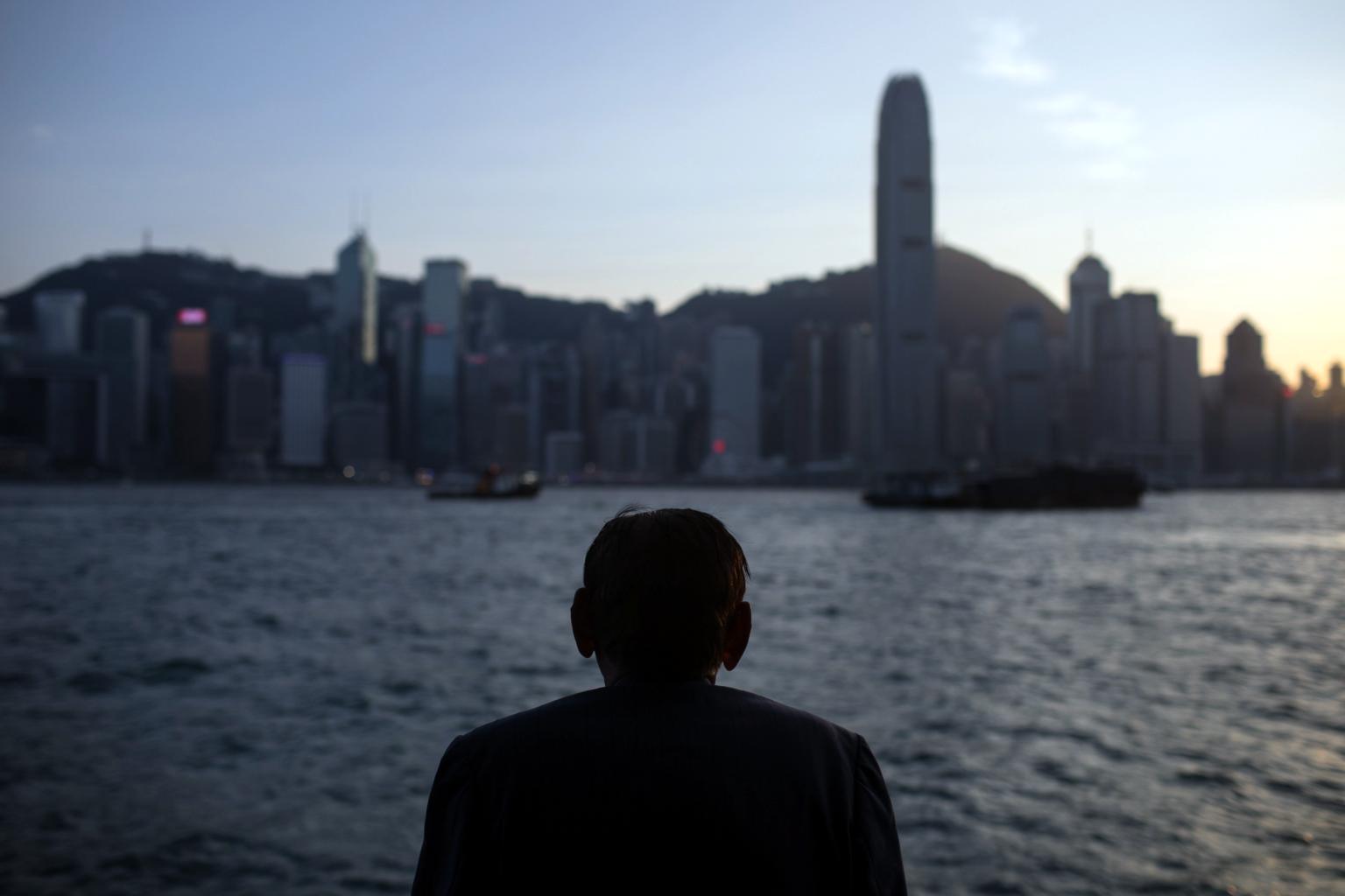 A man looking across the harbour towards the city skyline of Hong Kong island, on Feb 16, 2019.