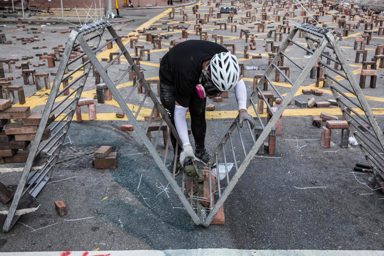 Mr Tsang, in his 30s, put on work gloves first and then started to remove barricades made of bricks and other rubbish from the road. Beside him, scores of people, by hands or using handcarts, worked together to move the blockage to the side of the road.