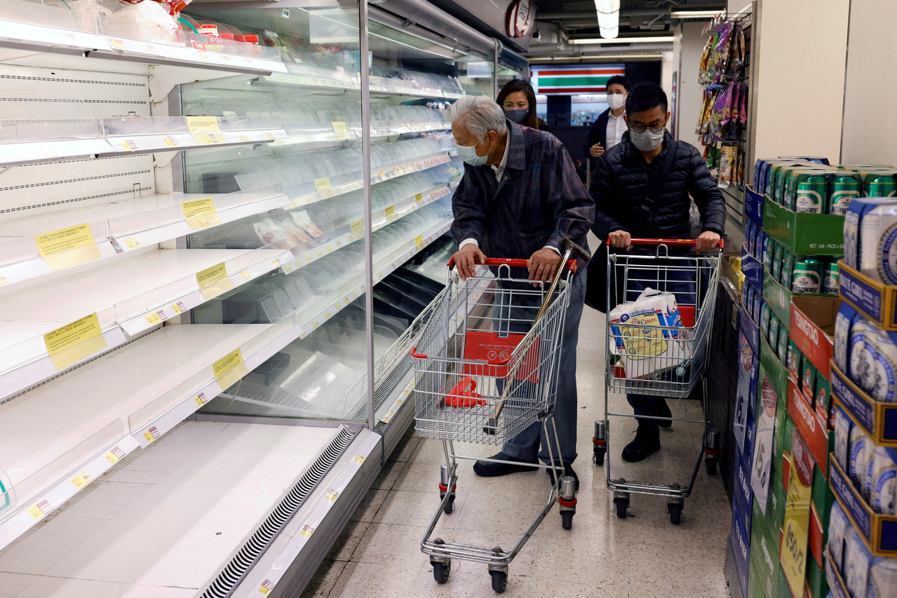 <p>Customers wearing masks shop in front of partially empty shelves at a supermarket during the coronavirus disease (COVID-19) outbreak in Hong Kong, China February 28, 2022. REUTERS/Tyrone Siu</p>