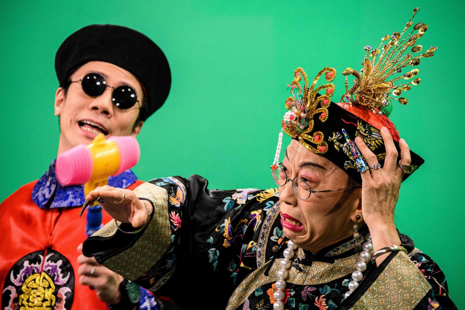 Hong Kong actors Tsang Chi-ho (left) and Ng Chi-sum act in the television show Headliner in Hong Kong, on June 17, 2020.