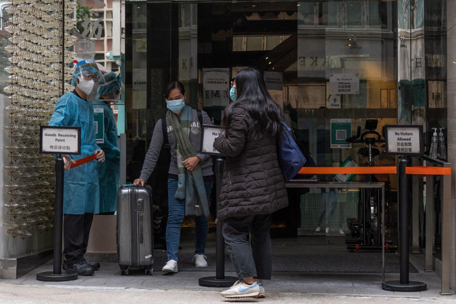 A woman leaves a quarantine hotel in Hong Kong on Feb 6, 2022.