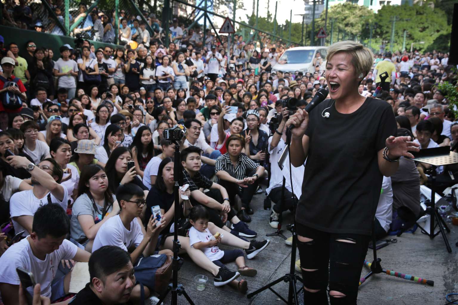 Playing her guitar on an open-air stage, Denise Ho sang to hundreds of waving fans packed onto the streets of the Sheung Wan district in a 90-minute show.