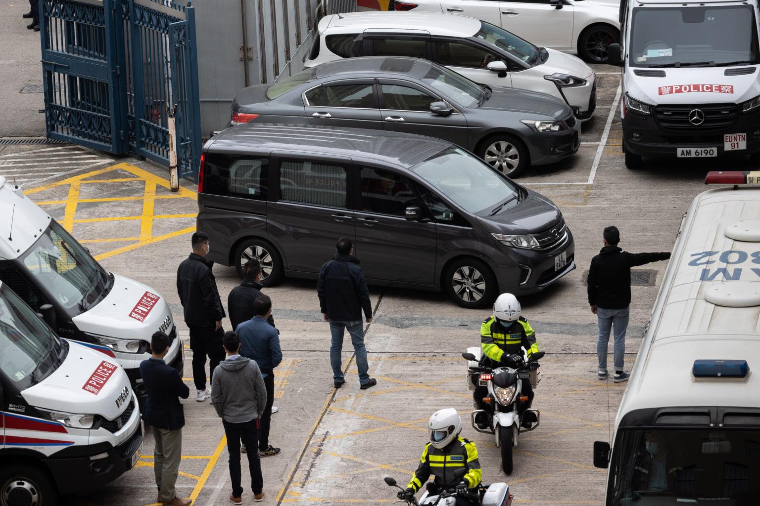 A van carrying activist Andy Li pulls into Tin Shui Wai Divisional Police Station in Hong Kong, on March 22, 2021.