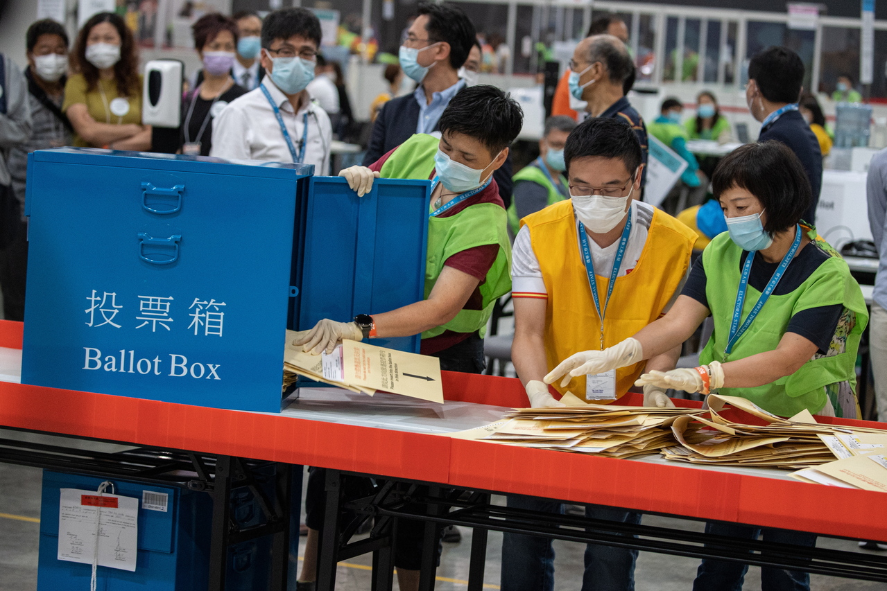 Officials opening a ballot box after the Election Committee Subsector Ordinary Elections in Hong Kong, on Sept 19, 2021.