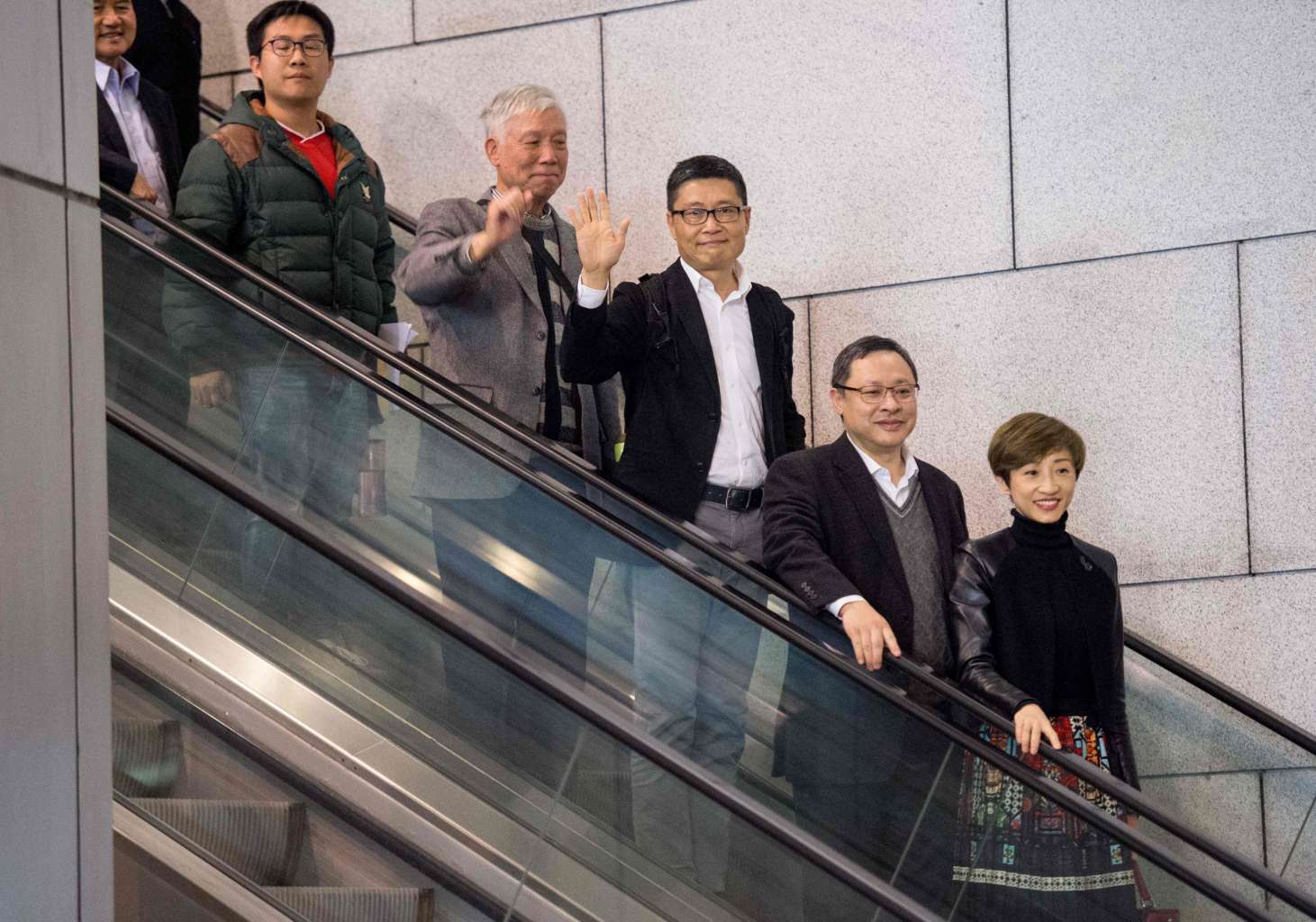 Members of Hong Kong's 'Umbrella Movement' gesture after being released on police bail in Hong Kong on March 27, 2017.