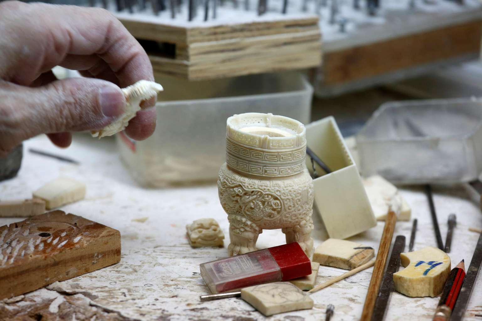 A half-finished ivory product from a government registered ivory tusk is seen in a factory in Hong Kong, on June 27, 2016.