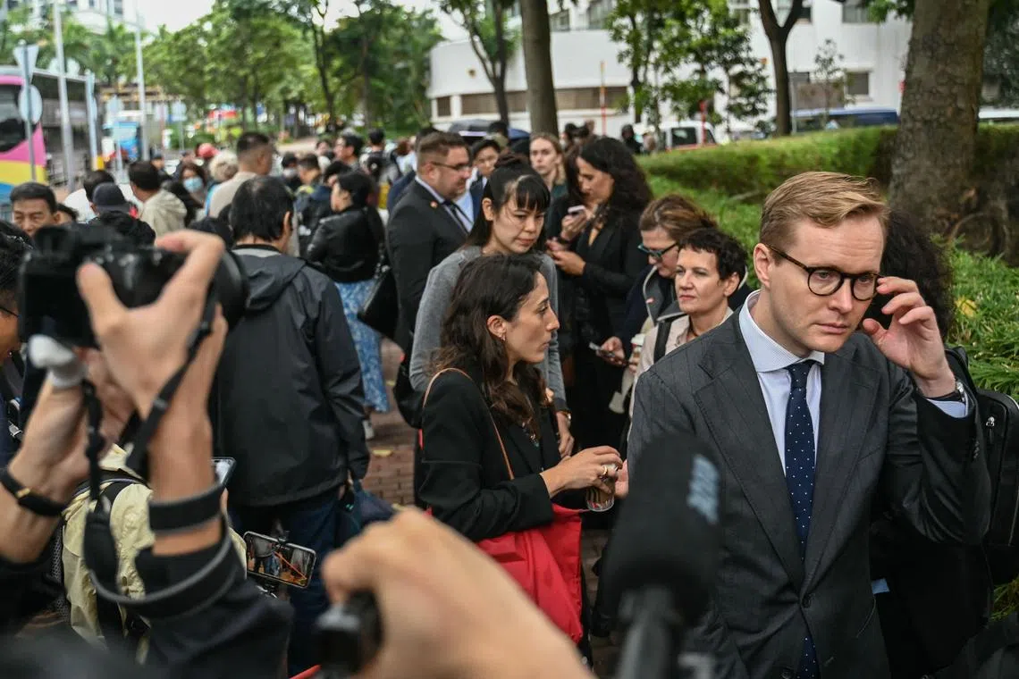 People, including diplomats, queueing outside the West Kowloon Magistrates’ Court in Hong Kong ahead of the sentencing Nov 19, 2024.