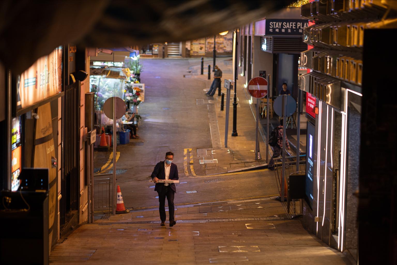 A photo taken on March 25, 2020, shows a man walking past closed bars in Lan Kwai Fong, Hong Kong.