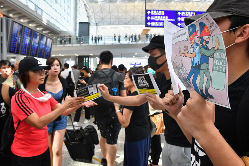 Protesters giving out pamphlets to passengers arriving at Hong Kong International Airport on July 26, 2019.