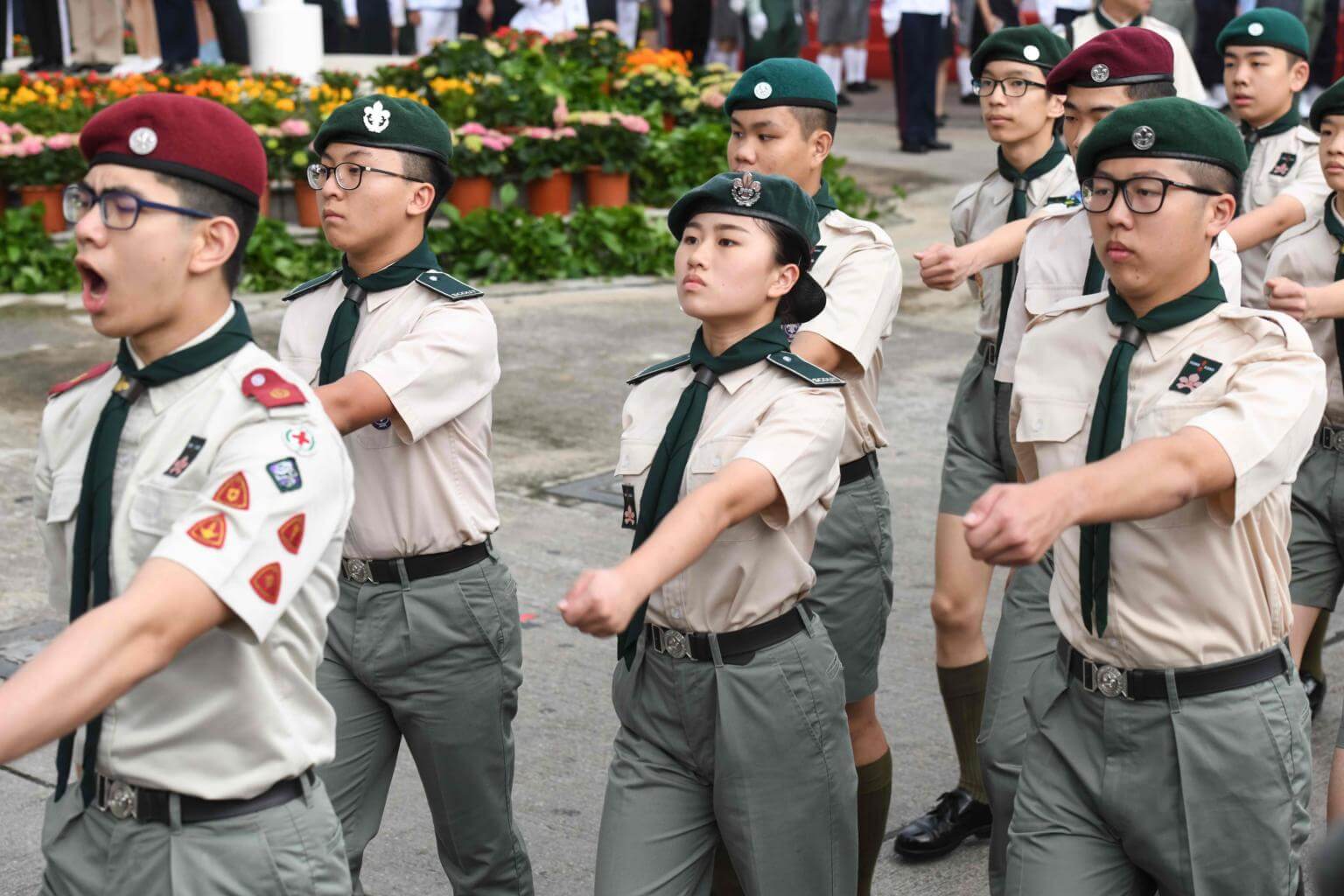 The one group that stuck with the PLA foot drill Friday was the Hong Kong Army Cadets Association (HKACA), set up in 2015, a year after massive student-led pro-democracy rallies in Hong Kong and seen by some observers as a tool to get Beijing's message across to young people.