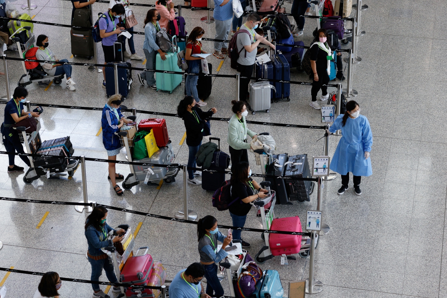Travellers queue up for shuttle bus rides to quarantine hotels at the Hong Kong International Airport on Aug 1, 2022.