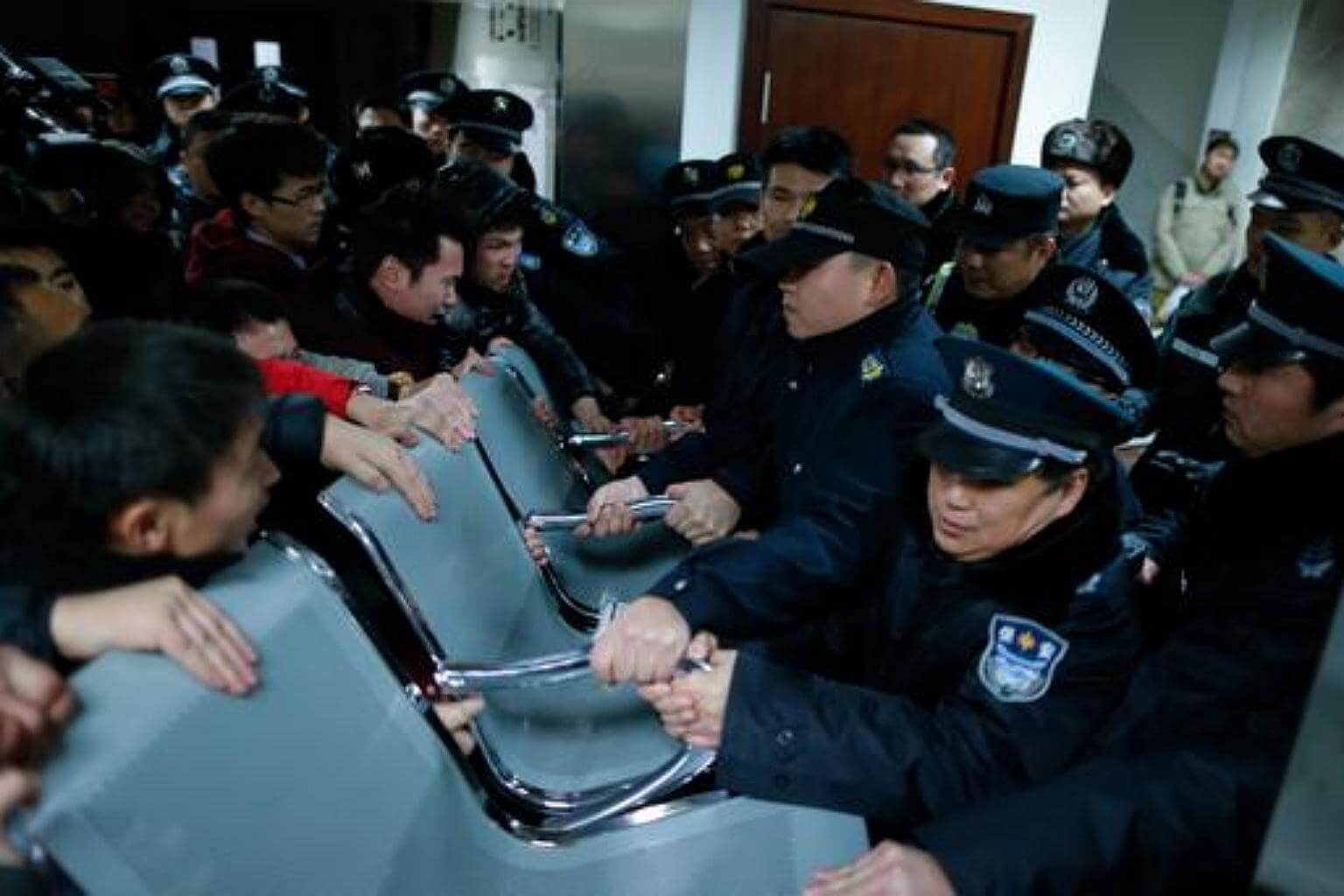 Angry family members of patients clash with security personnel at a hospital in Shanghai on Jan 1, 2015.