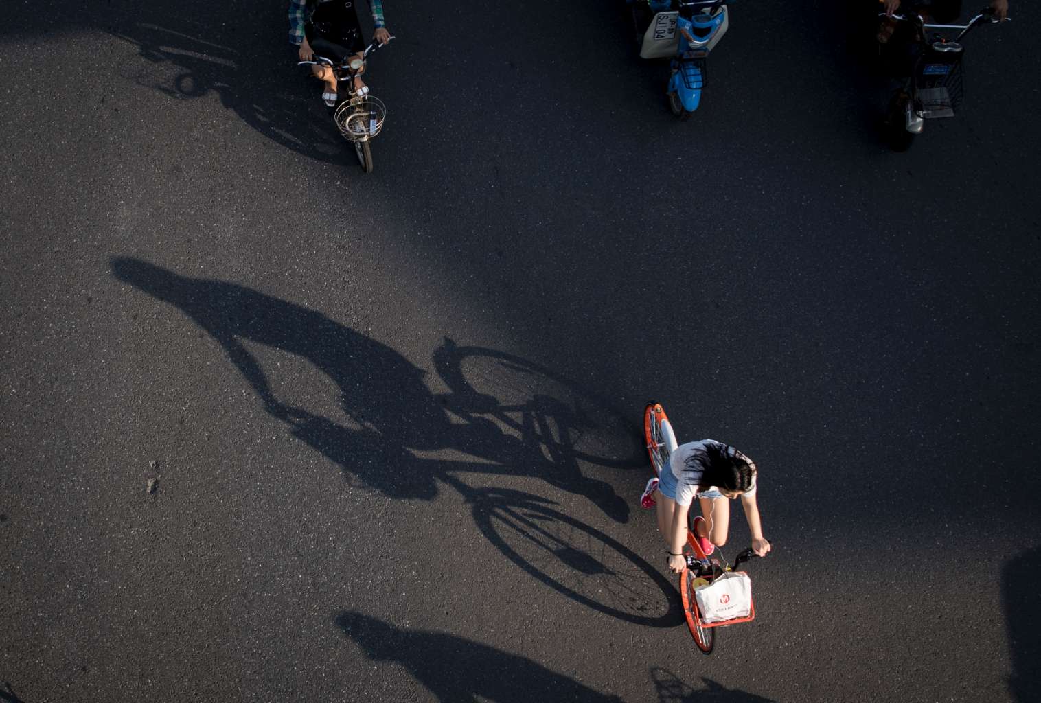 A girl rides a bicycle in Shanghai, on July 3, 2017.