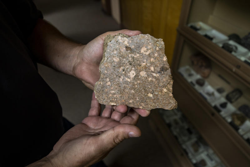 An employee displays a piece of raw ore pulled from the Mountain Pass mine, in Mountain Pass, California, US, on Friday, June 7, 2019.