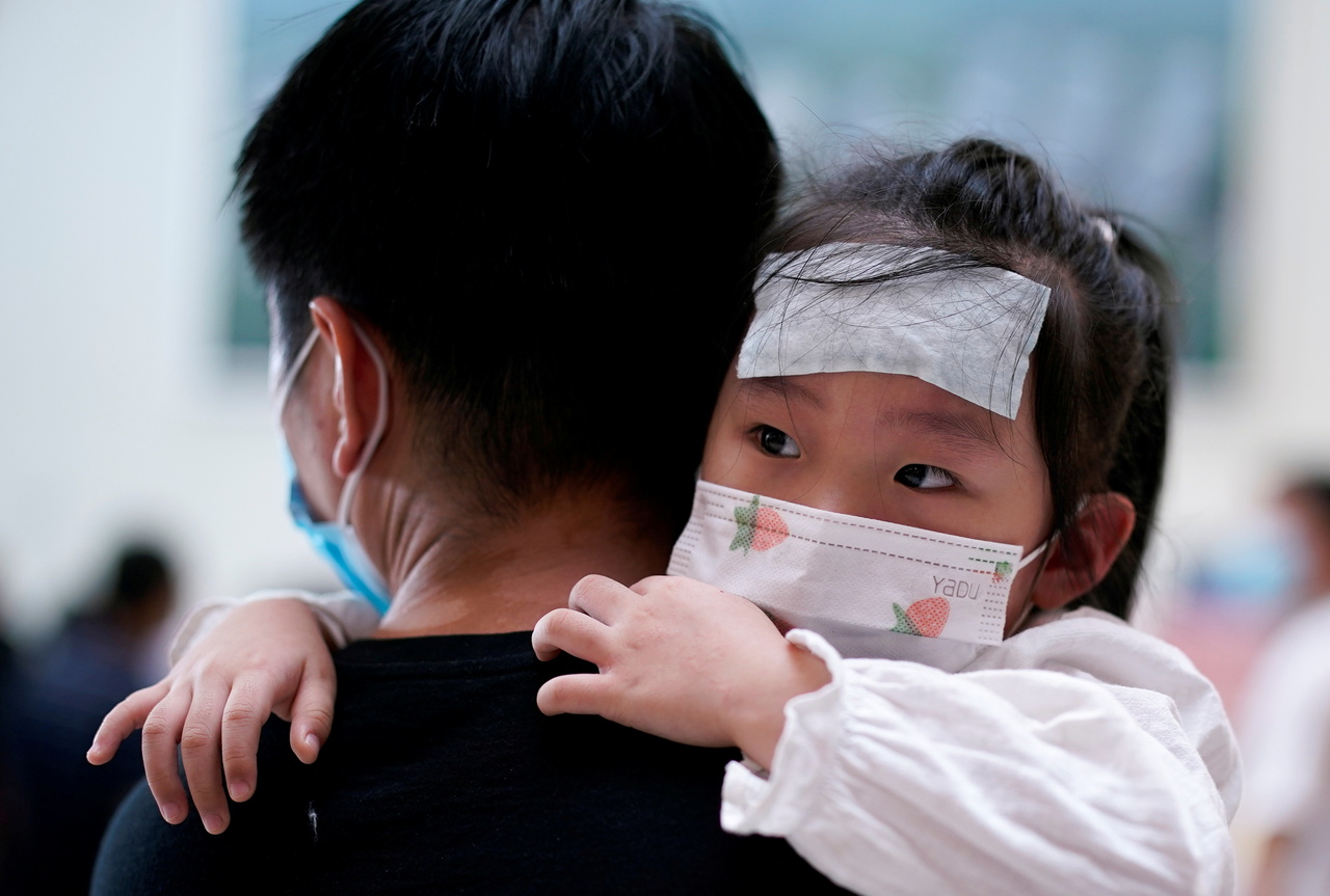 A man carries a child wearing a face mask in Wuhan, China, on Sept 3, 2020.