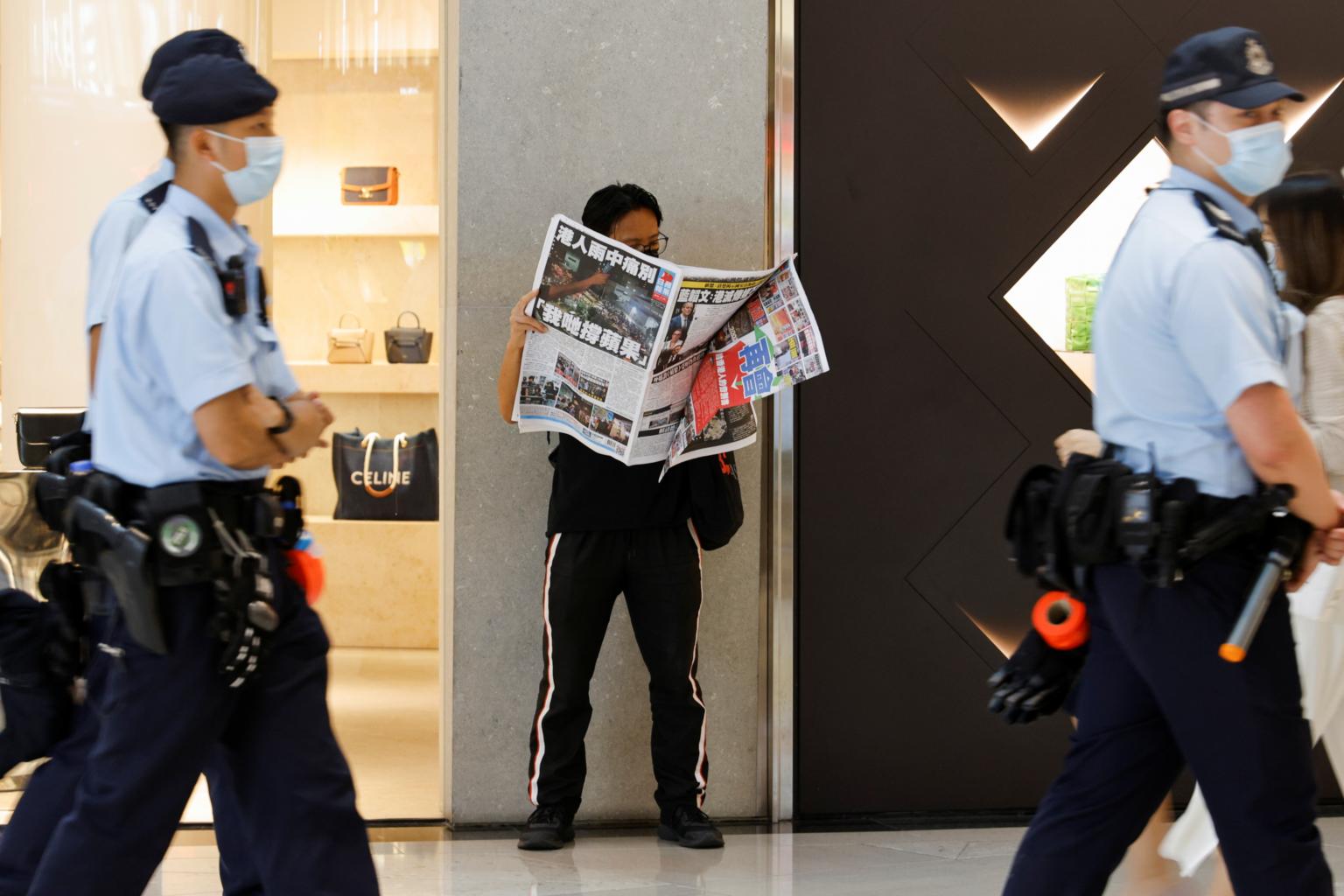 Hong Kong police officers patrolling past a man reading the final edition of Apple Daily in Hong Kong on June 24, 2021.
