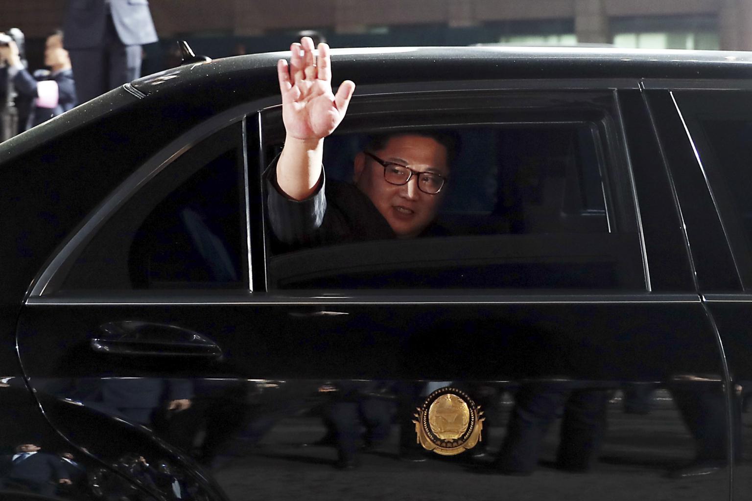 North Korean Leader Kim Jong Un waves from a car as he departs the truce village of Panmunjom on South Korea, on April 27, 2018.