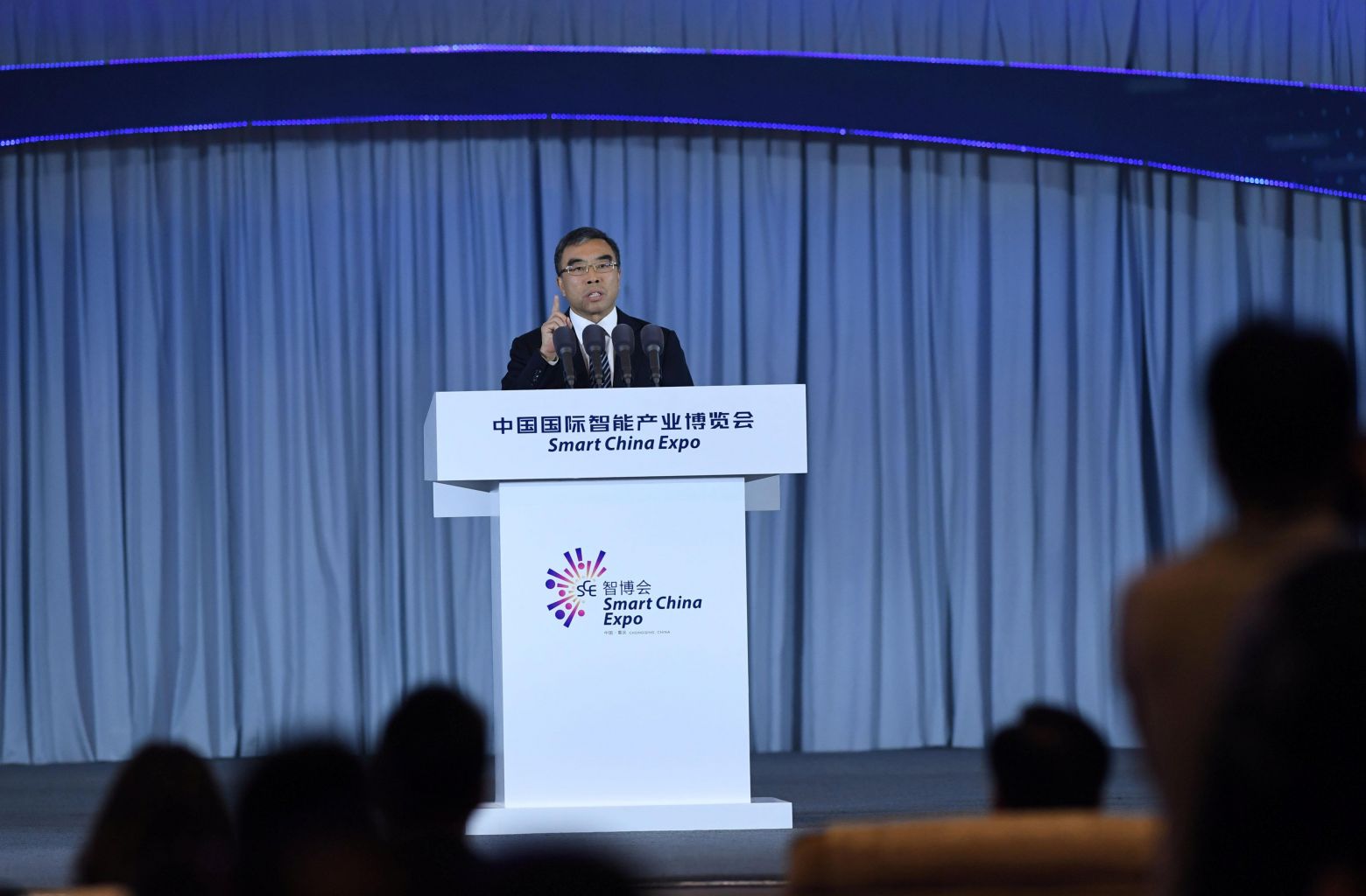 Huawei Technologies chairman Liang Hua speaking at the first Smart China Expo in Chongqing, China, on Aug 23, 2018.