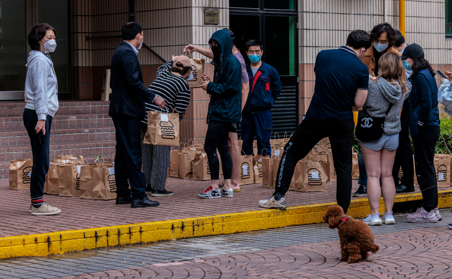 People gather to take their share of burgers delivered for the first time in 23 days to a residential community under lockdown in Shanghai, on April 23, 2022.