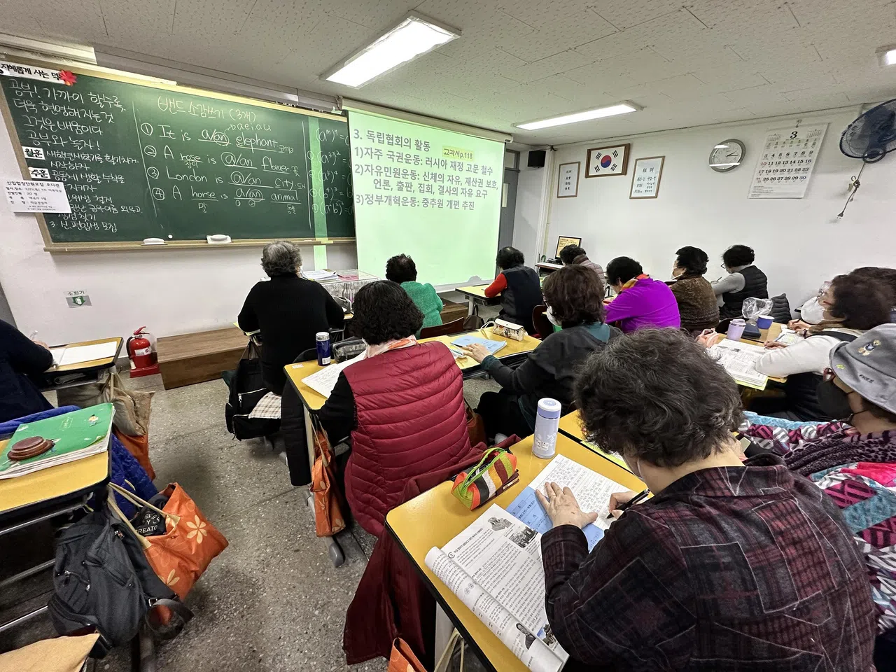 This is a scenario not out of place in a normal school, but what stands out are the telltale heads of silver hair and tight curls – characteristics associated with South Korean middle-aged aunties and grannies.