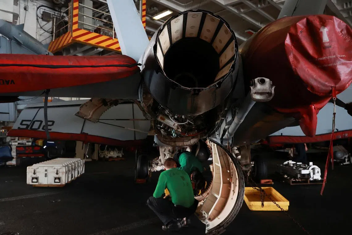 MH-60 Seahawk helicopters and F/A-18 Hornet jets bearing pilot call signs like “Fozzie Bear”, “Pig Sweat” and “Bongoo” emit deafening screams as they land in the drizzle on the Nimitz, which is leading a carrier strike group that entered the South China Sea two weeks ago.