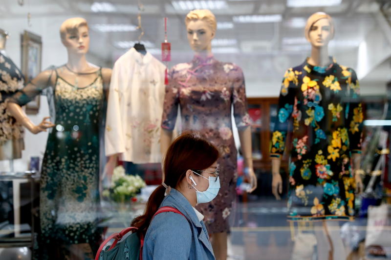 A woman wearing a protective face mask walks in the street, in Taipei, on Feb 27, 2020.