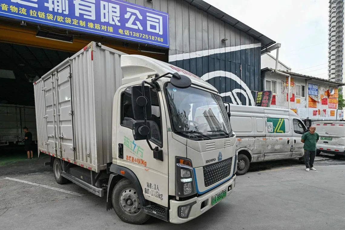 A truck carrying goods for delivery leaves a warehouse of the Weijiang International delivery company in Guangzhou.